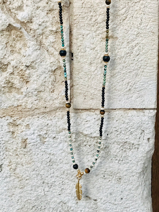My Tribal collection is inspired by and most resembles the traditional Malla, representing the "hippie vibes" in me . Although this collection varies and changes depending on the stones that inspire me at the time, African Turquoise, River Stones and Tiger Eyes are my usual go to for this collection. I also love using Golden Pyrite to accent, add a bit of elegance and bring out the beauty of the gem stones.