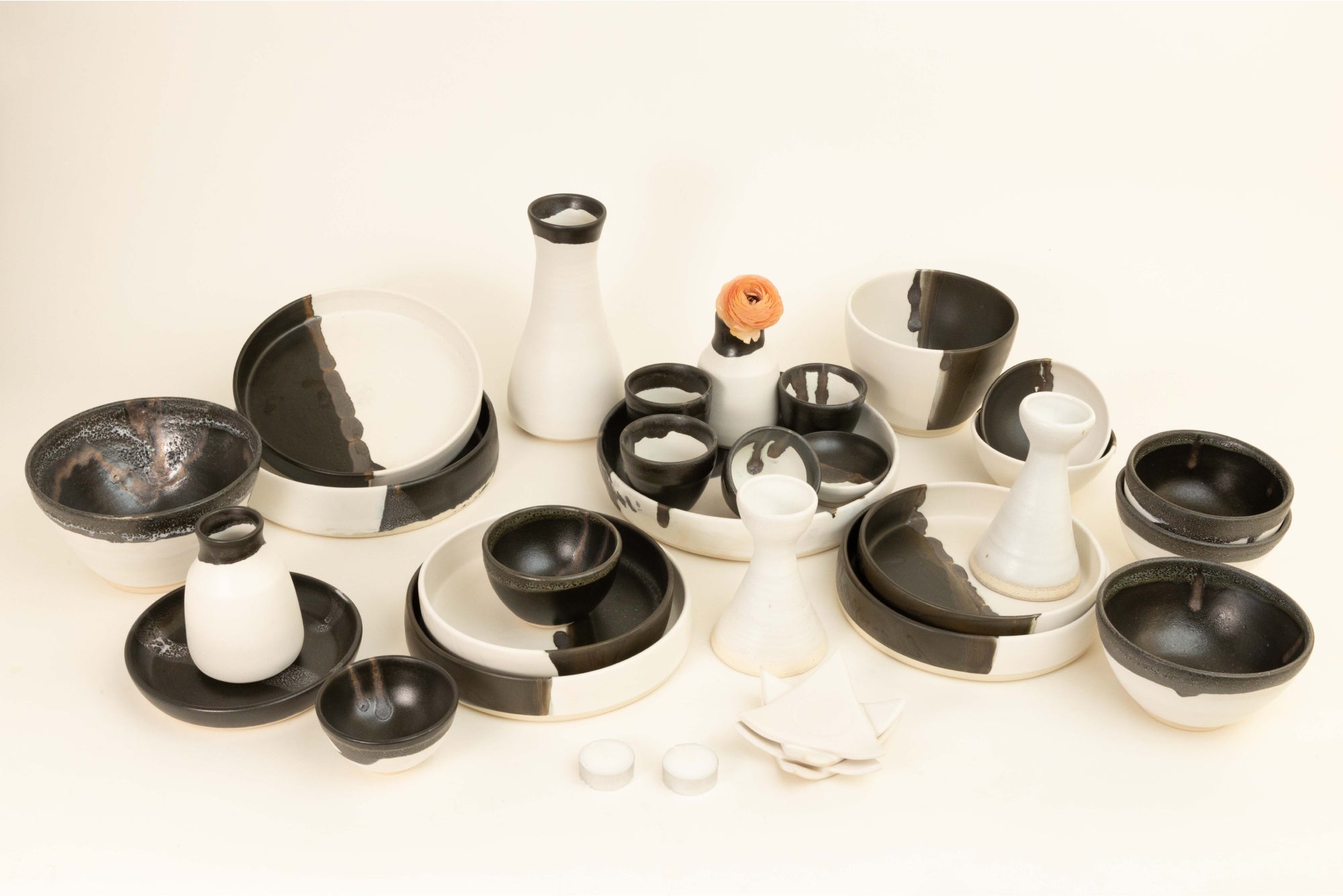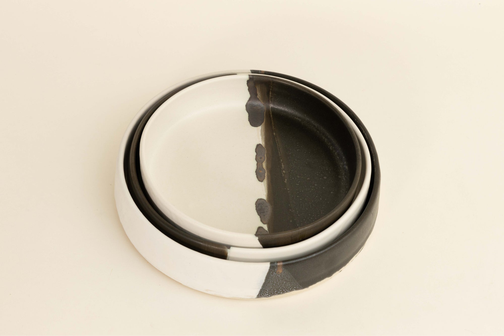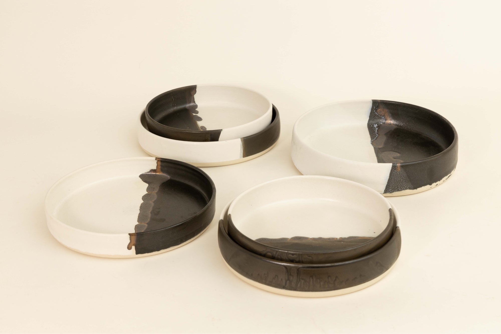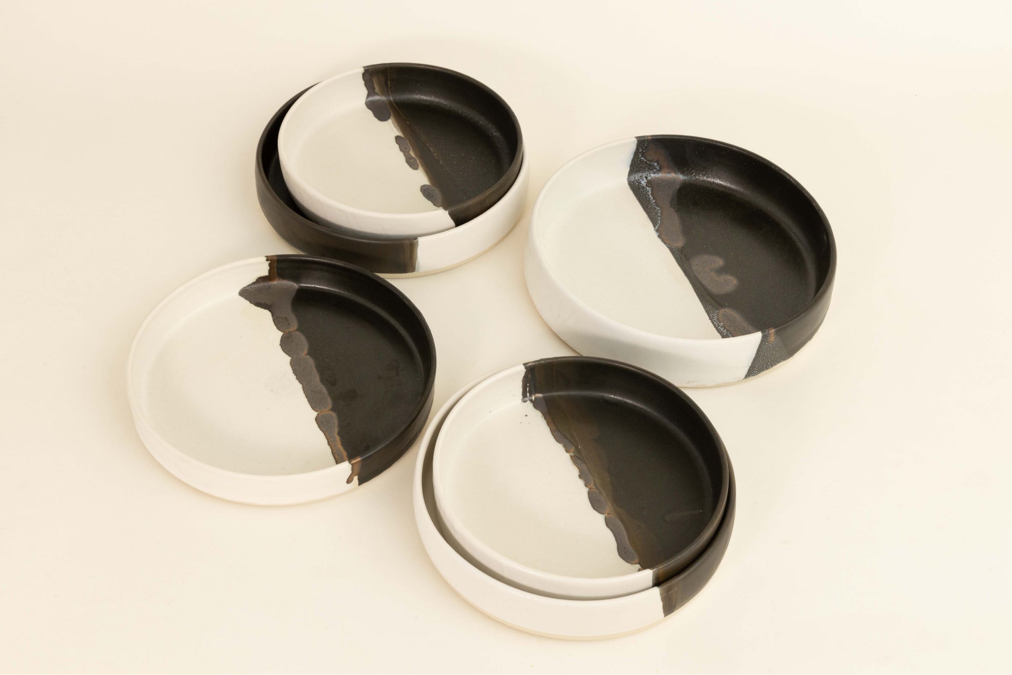 White Stoneware and/ or Porcelain wheel thrown Platters, Bowls, Tumblers, Side walled plates, mini vases/ Pourers, etc. This line is made for the elegant and art deco home. Half and half glazed with Marshmallow matte and Charcoal black matte glazes. Some of this line will have a light line of copper brushed on through the middle of the piece or on the lip. Available for special orders of sets.