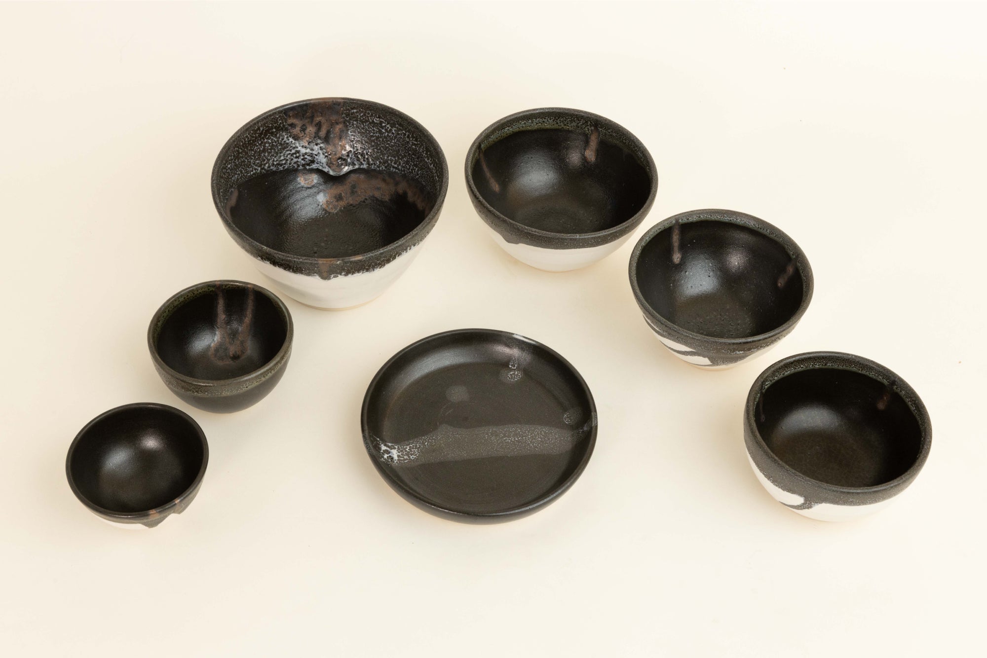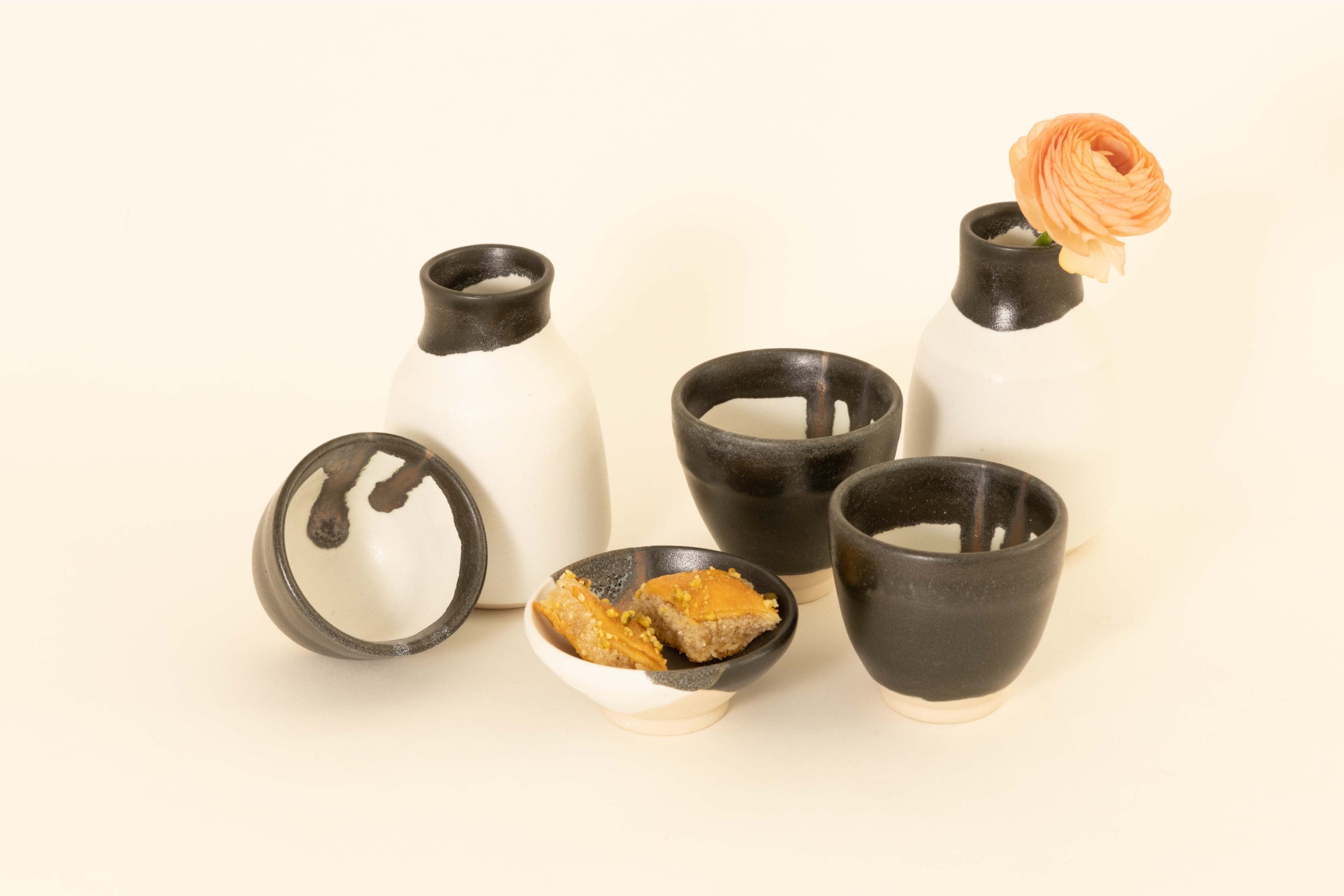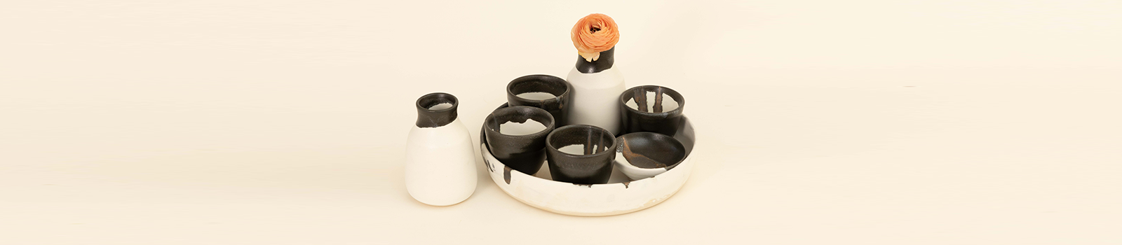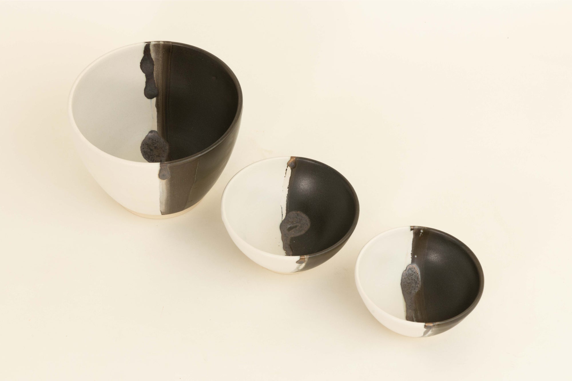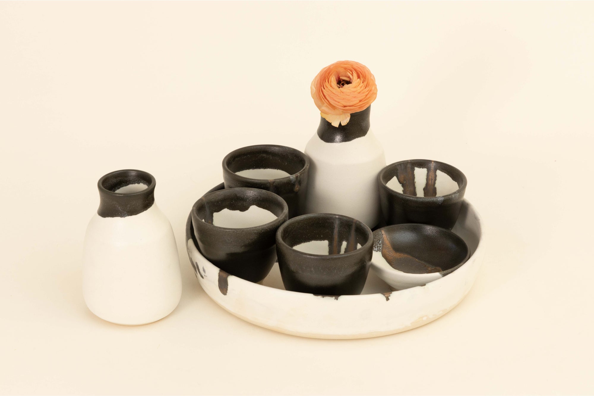 White Stoneware and/ or Porcelain wheel thrown Platters, Bowls, Tumblers, Side walled plates, mini vases/ Pourers, etc. This line is made for the elegant and art deco home. Half and half glazed with Marshmallow matte and Charcoal black matte glazes. Some of this line will have a light line of copper brushed on through the middle of the piece or on the lip. Available for special orders of sets.