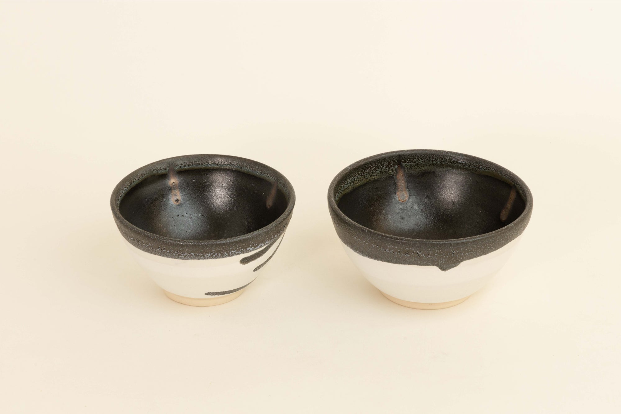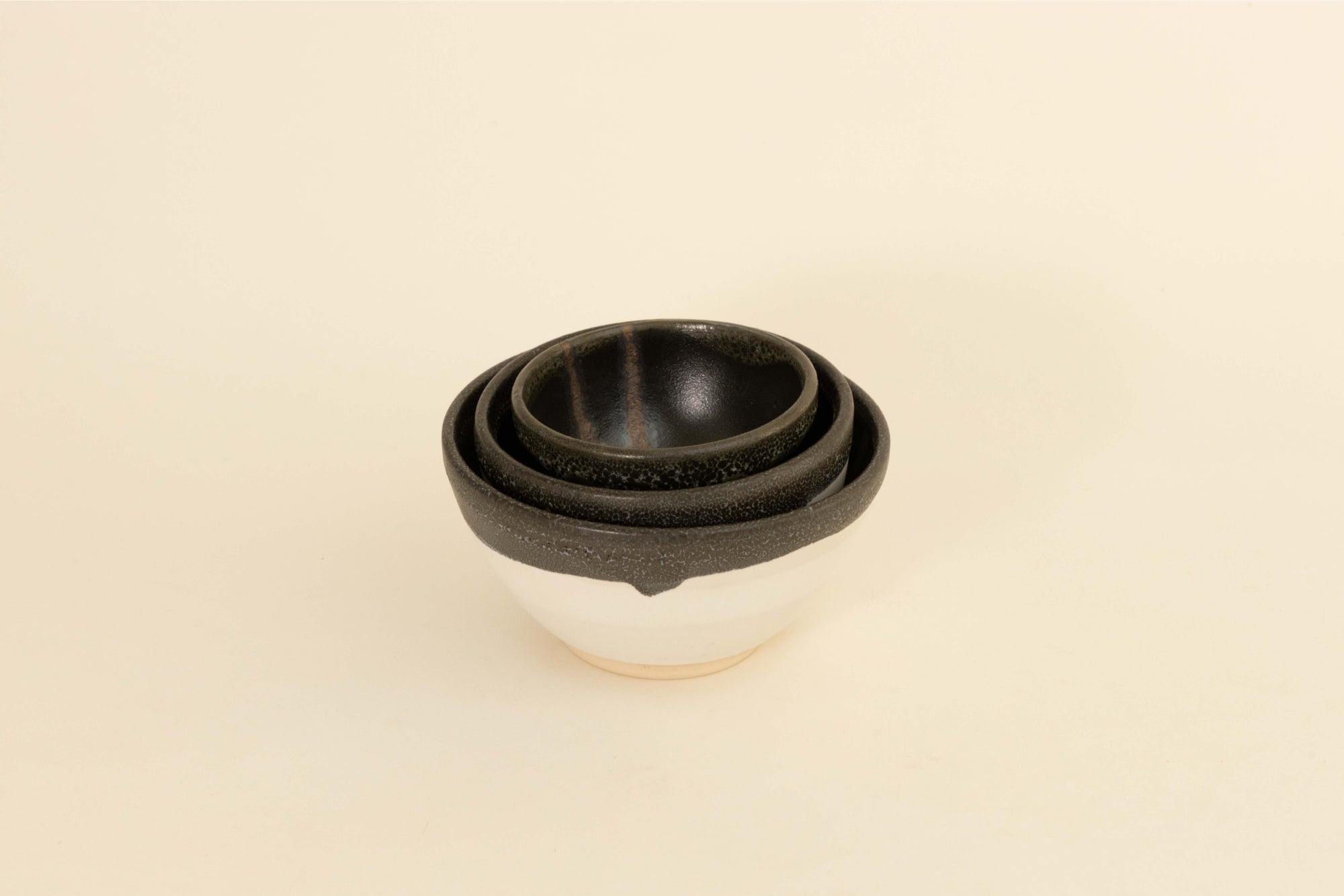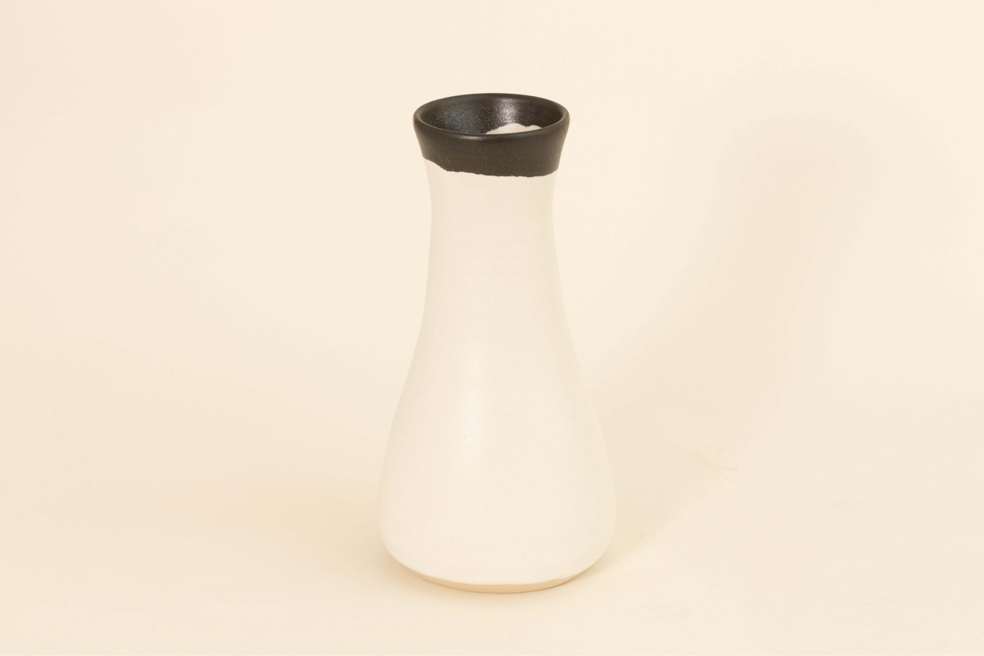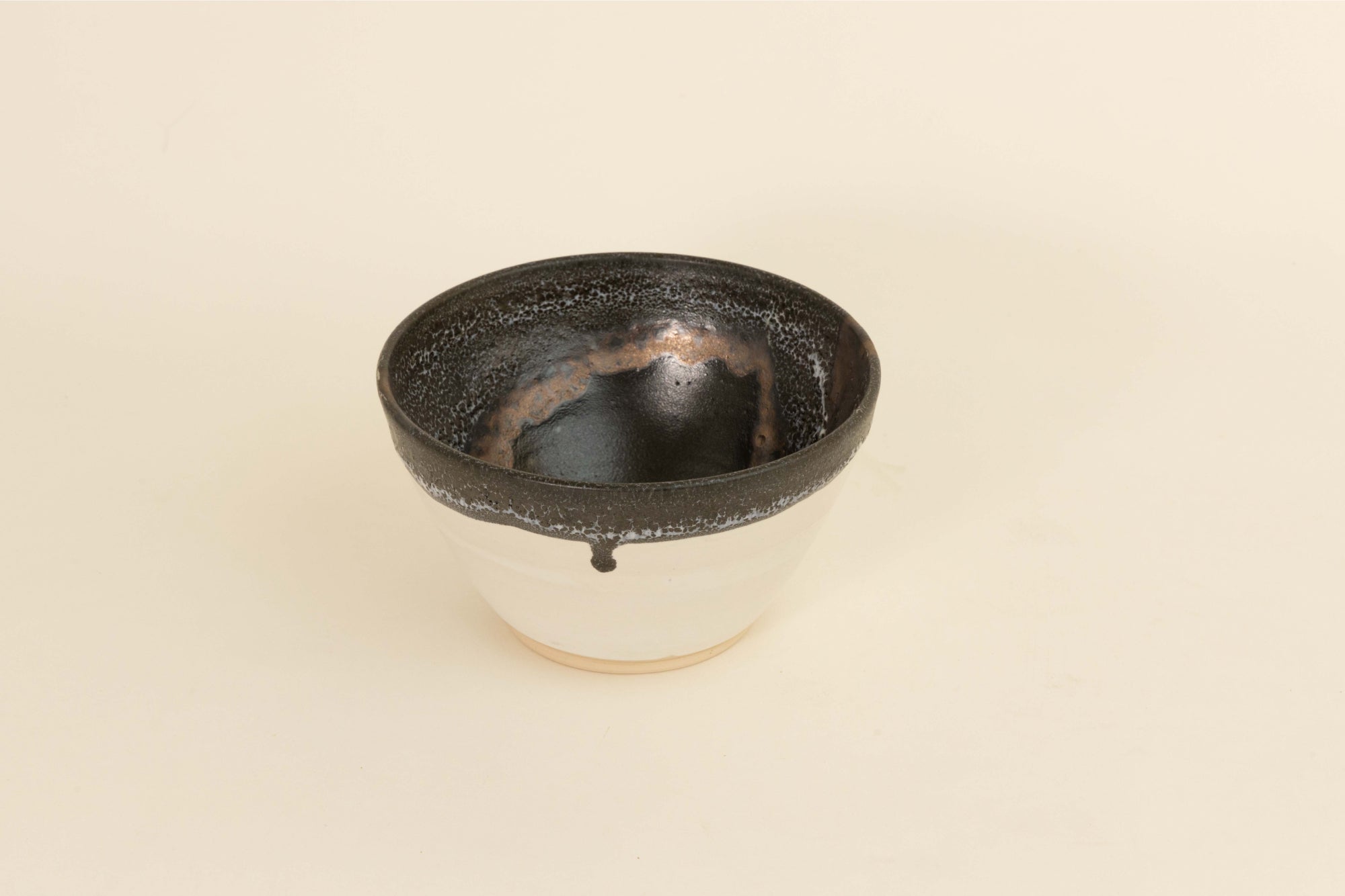 White Stoneware and/ or Porcelain wheel thrown Platters, Bowls, Tumblers, Side walled plates, mini vases/ Pourers, etc. This line is made for the elegant and art deco home. Half and half glazed with Marshmallow matte and Charcoal black matte glazes. Some of this line will have a light line of copper brushed on through the middle of the piece or on the lip. Available for special orders of sets.