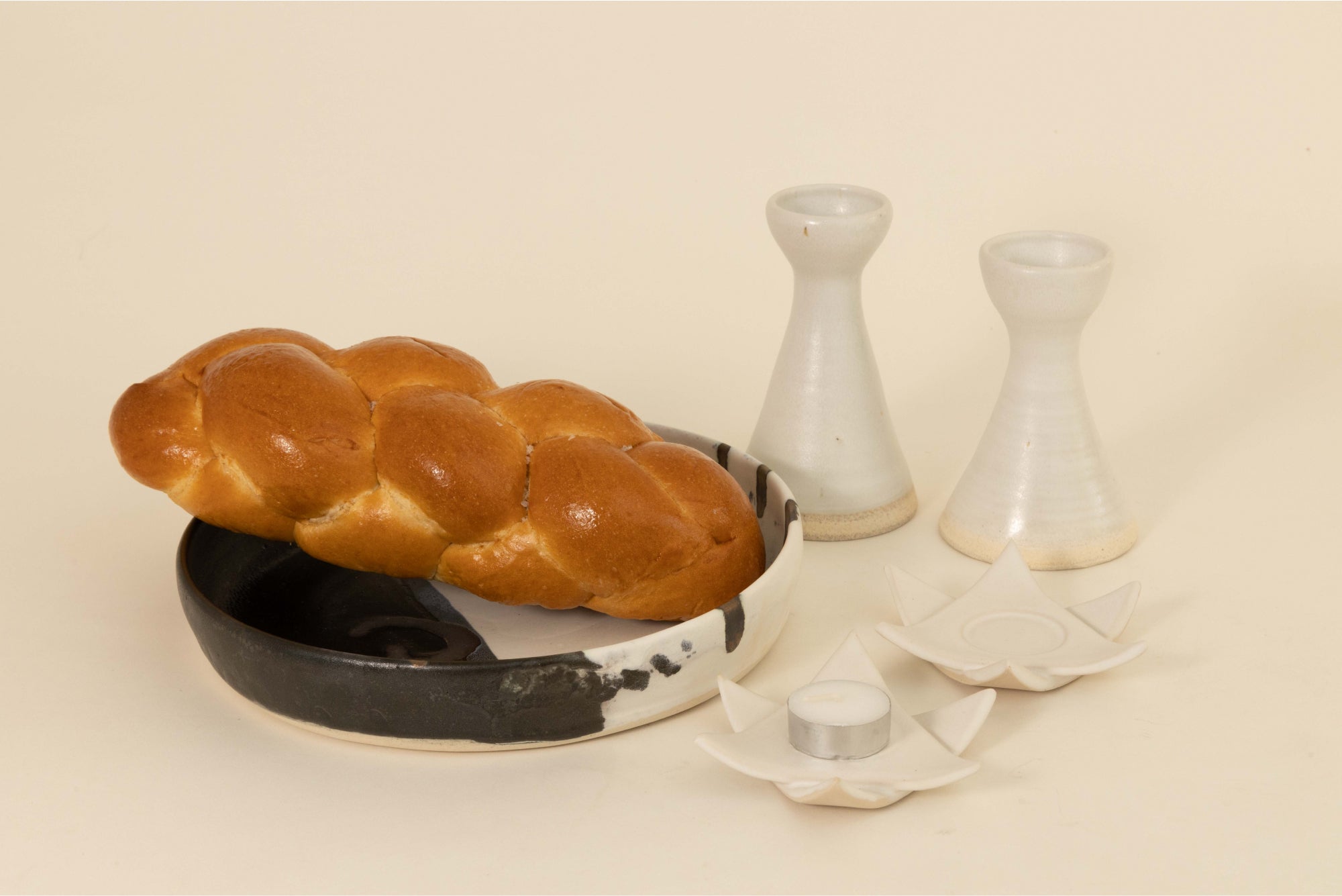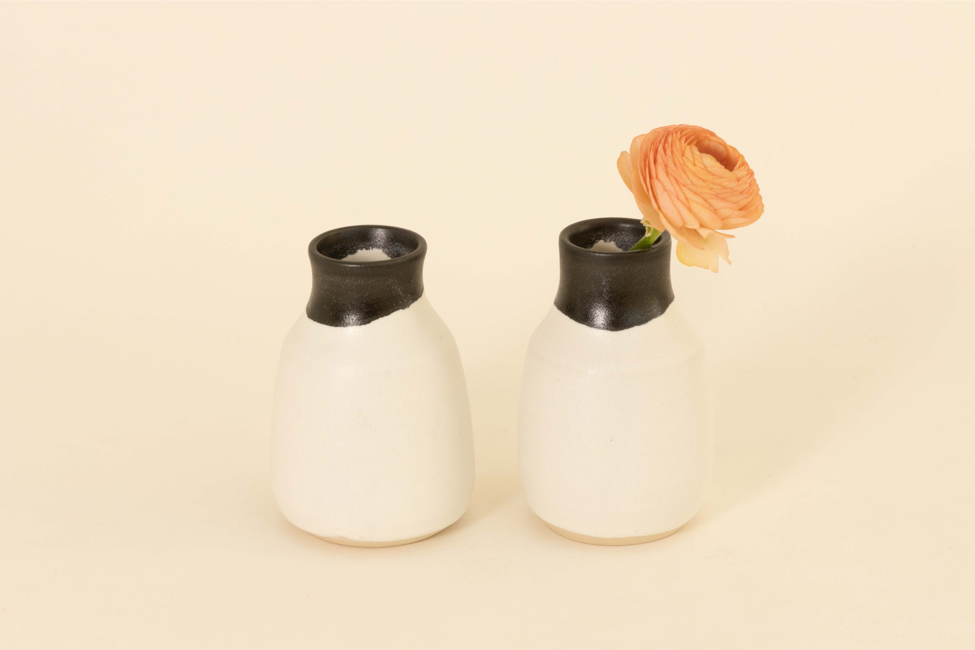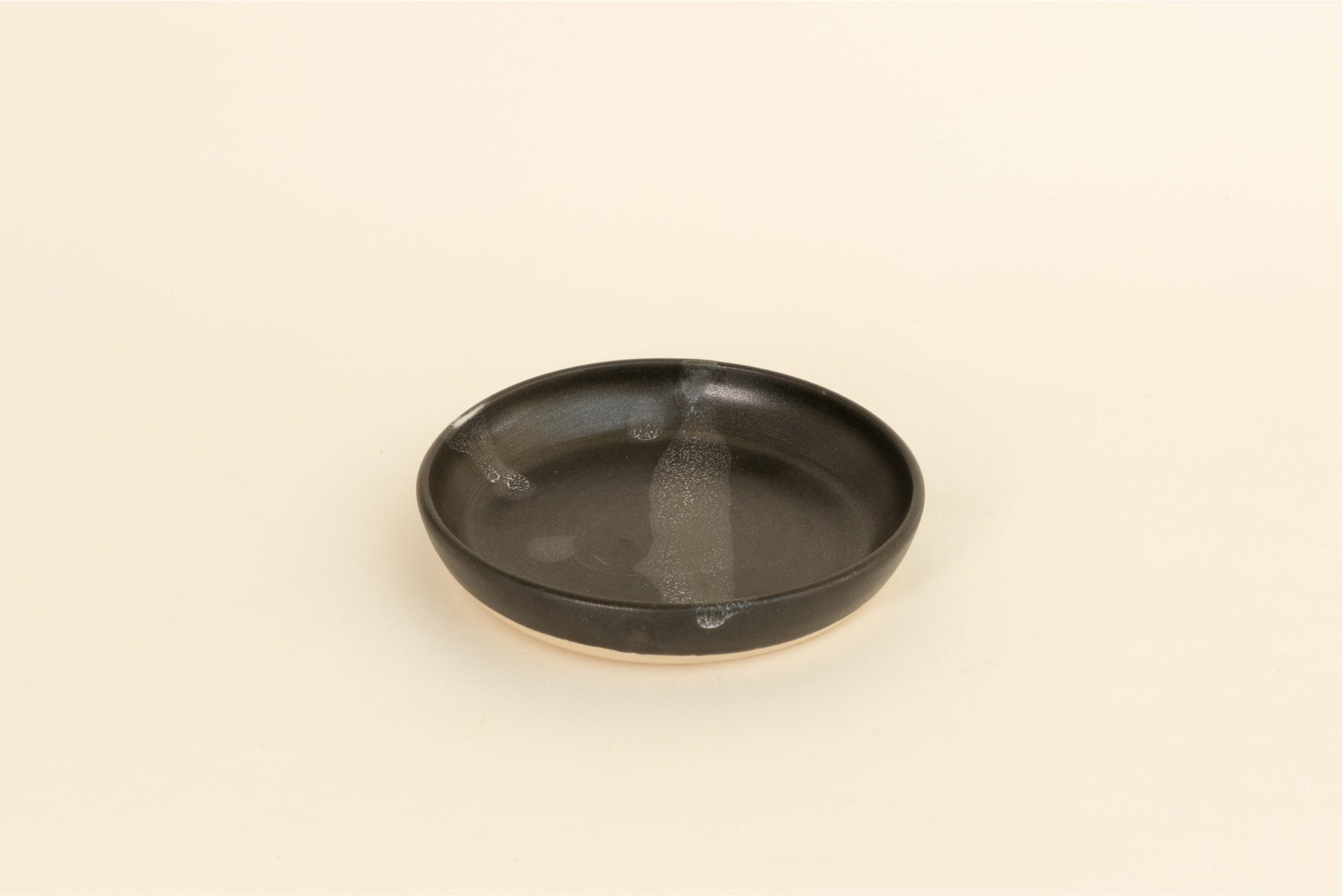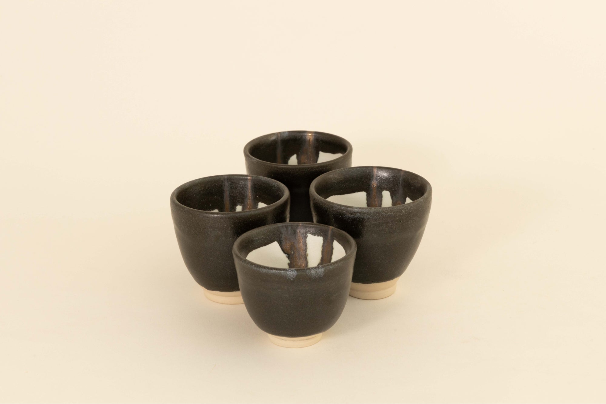 White Stoneware and/ or Porcelain wheel thrown Platters, Bowls, Tumblers, Side walled plates, mini vases/ Pourers, etc. This line is made for the elegant and art deco home. Half and half glazed with Marshmallow matte and Charcoal black matte glazes. Some of this line will have a light line of copper brushed on through the middle of the piece or on the lip. Available for special orders of sets.
