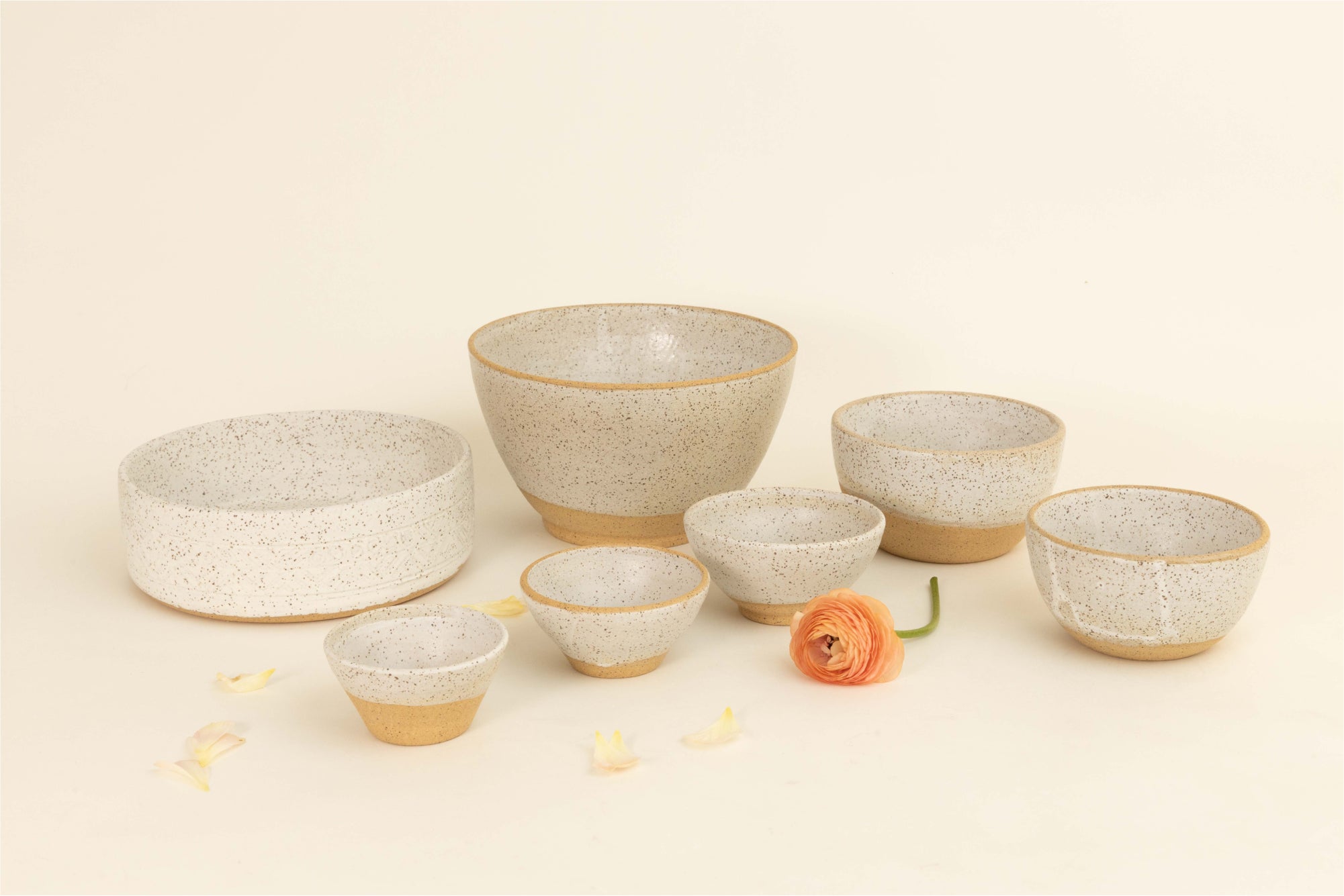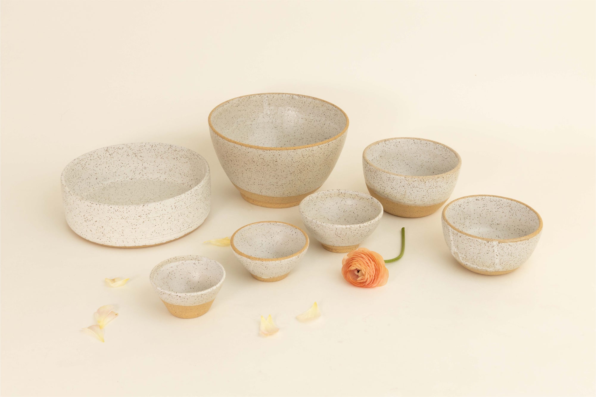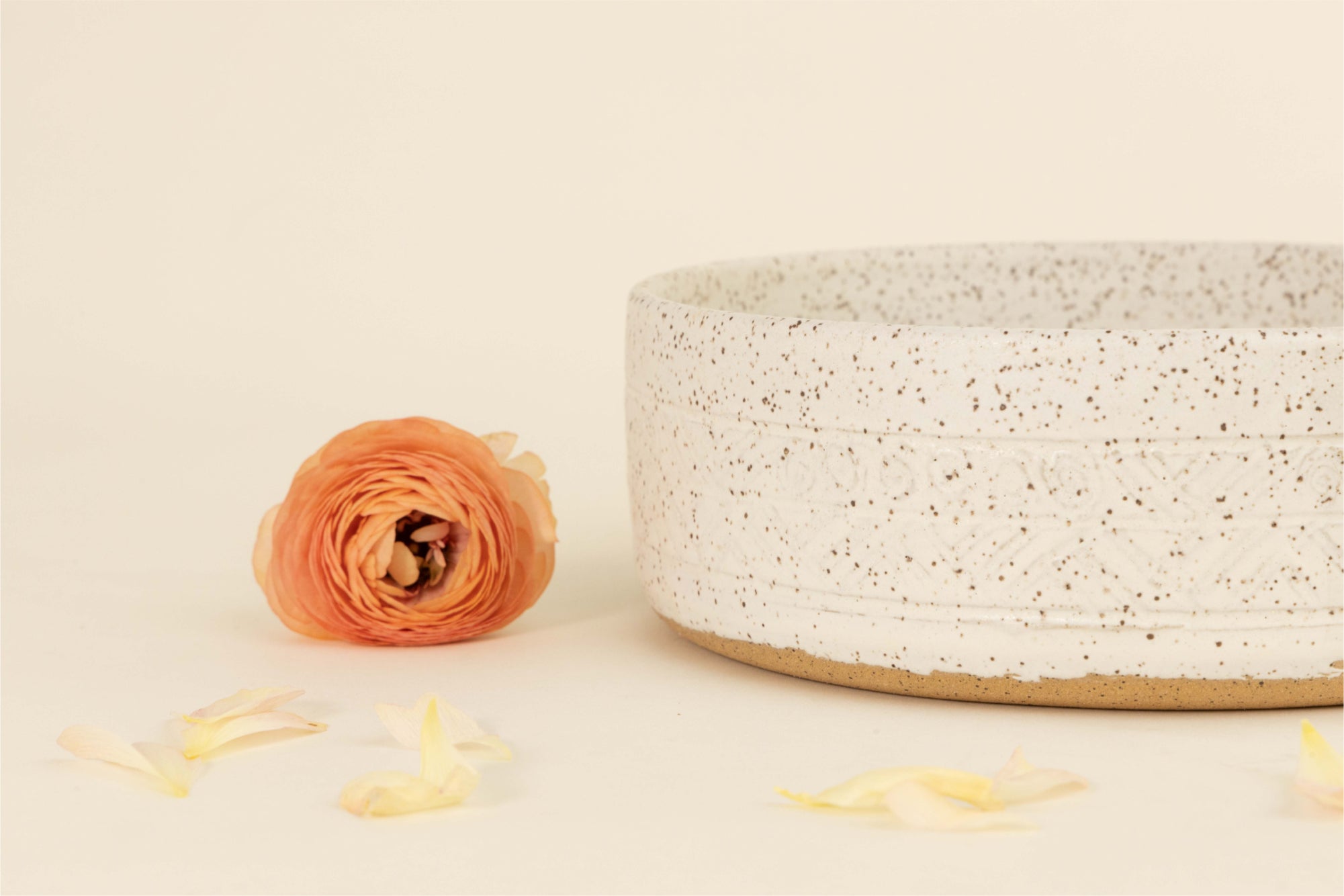 Platters, sidewall plates and bowls all wheel thrown and hand altered. For those of you who prefer just white. this line can be made both rustic and elegant, depending on the clays used. All pieces are glazed with the white marshmallow matte and hand carved design around the ring.