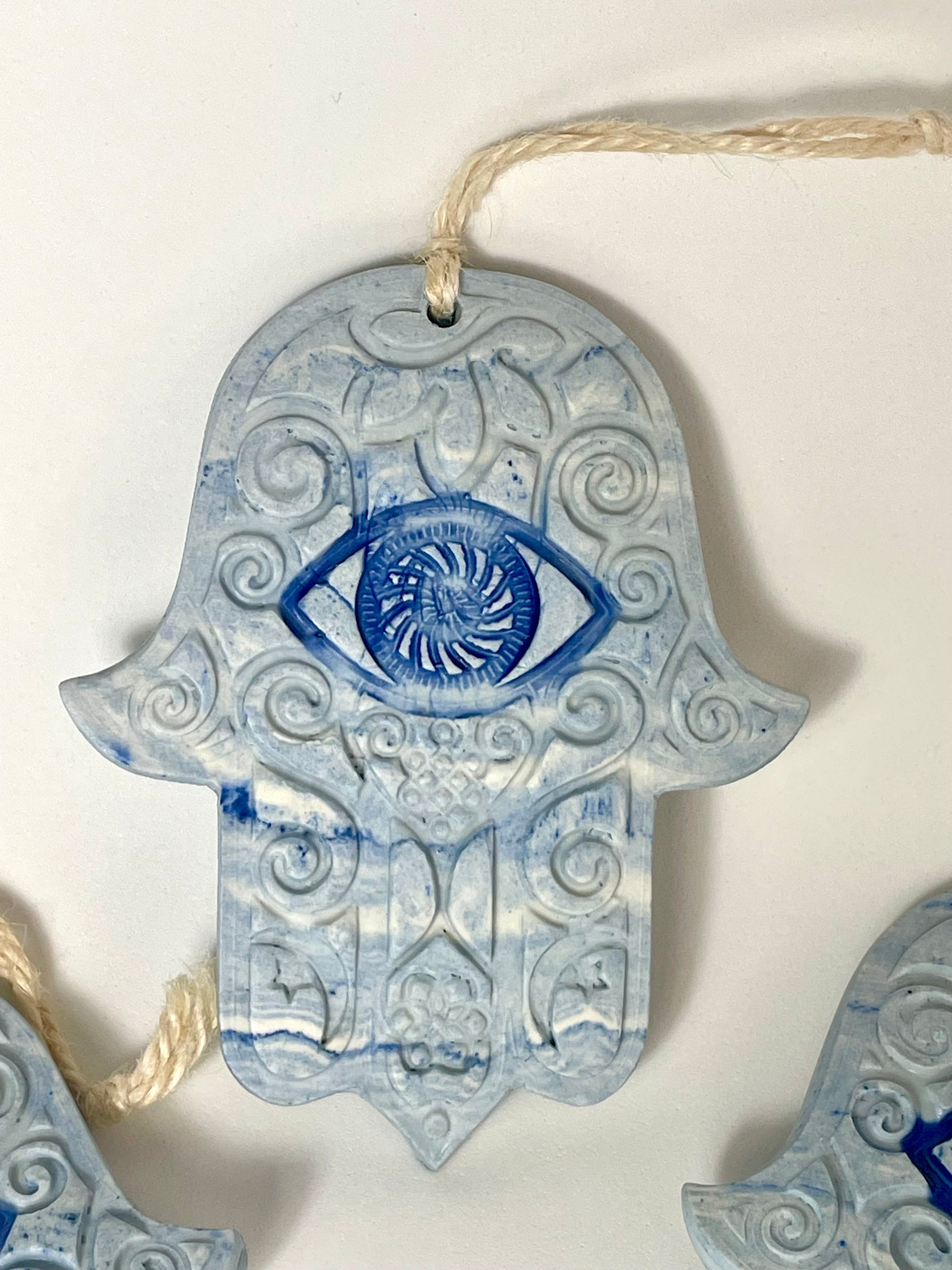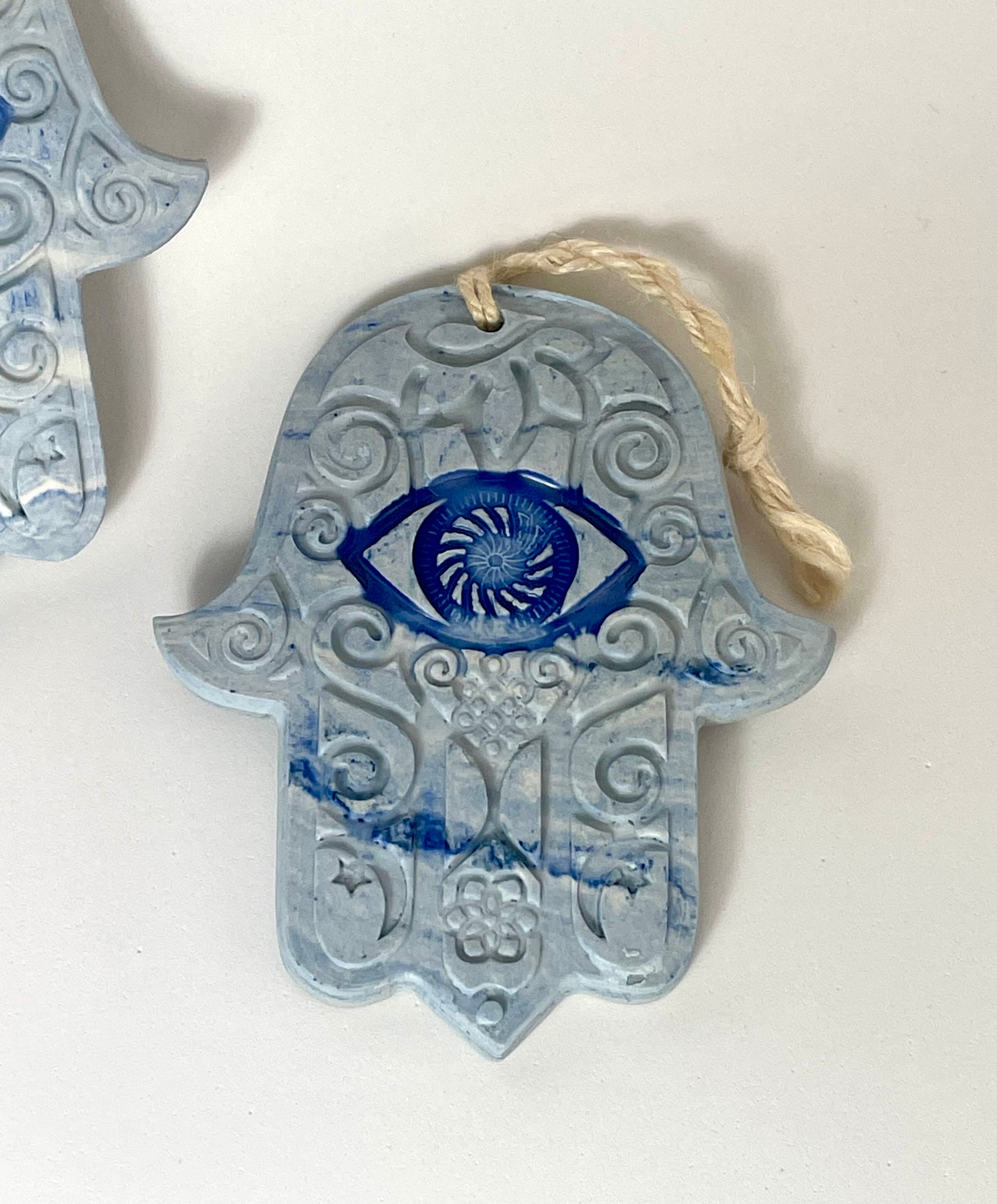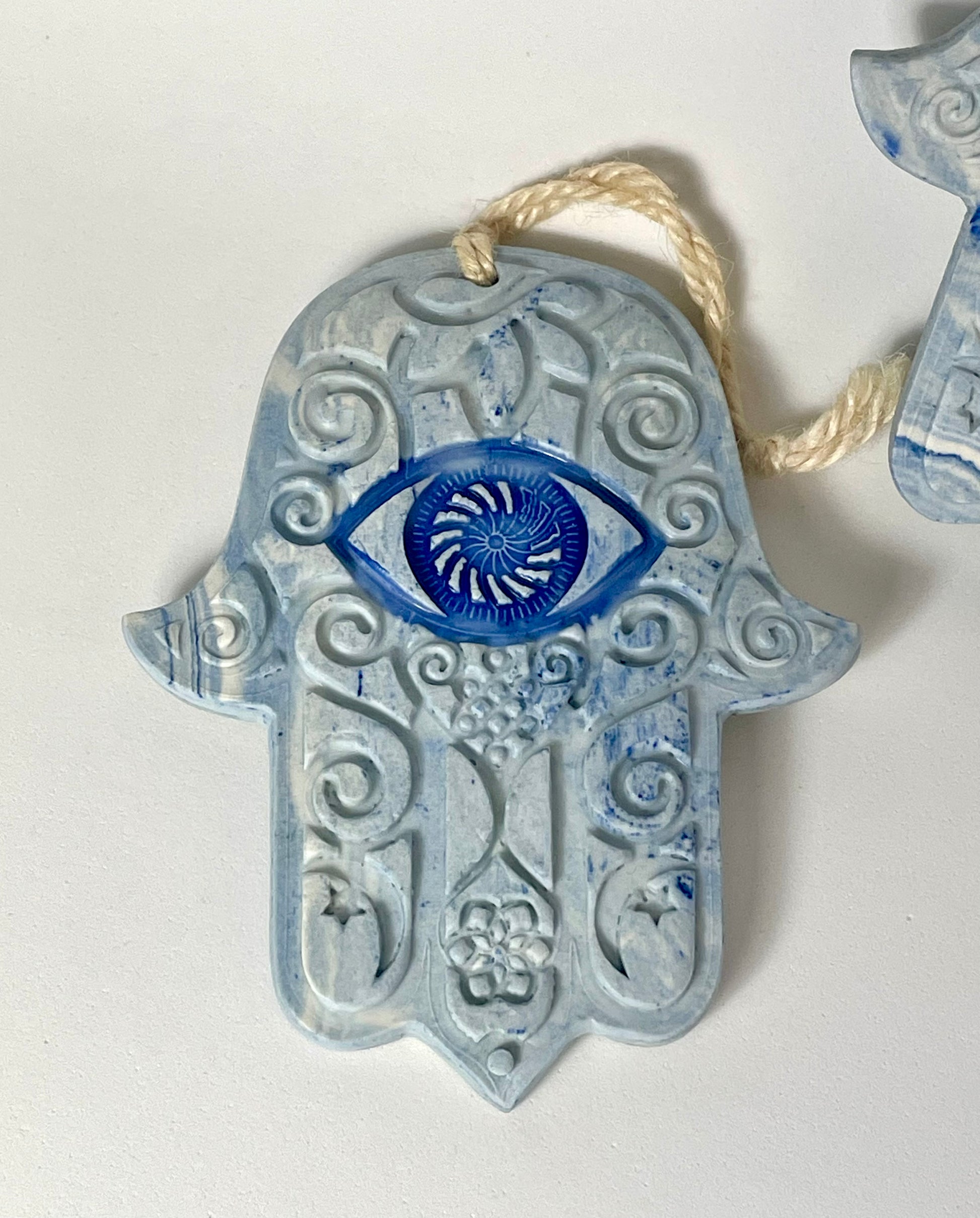 These beautiful Hamsah wall ornaments are handmade from white porcelain with striking cobalt blue marble patterns swirled throughout. Each one is finished with a soft matte glaze that gives it a gentle, understated look. The Hamsah is an ancient symbol of protection and good fortune, making these ornaments meaningful additions to any home. Because each piece is hand-marbled, no two are exactly alike—the natural variation in the cobalt veining ensures your ornament is truly one of a kind. The matte finish adds to their charm, creating a sophisticated yet approachable aesthetic that complements various décor styles. Perfect for displaying on a wall where you want to add a touch of handcrafted artistry and cultural significance. Whether you're drawn to the spiritual meaning of the Hamsah or simply appreciate the beauty of handmade ceramics, these ornaments bring warmth and character to your space.